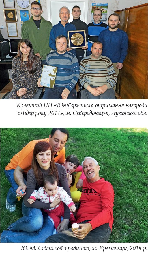 Завдяки залученню в команду провідних фахівців будівельної галузі та державних проектних інститутів Луганщини підприємство на протязі багатьох років успішно розробляло робочі проекти та виконувало будівельно-монтажні роботи. Але, внаслідок військових дій на сході України, підприємство спочатку призупинило свою діяльність, а наприкінці 2014 р. переїхало до м. Києва. Переїхавши до Києва — підприємство в першу чергу почало працювати над розробкою проектів і відновленням соціально значимих громадських будівель та об’єктів інженерної інфраструктури Луганщини, після чого йому було запропоновано виконувати замовлення і на інших територіях України. Нині Ю. М. Сіденьков є генеральним директором ТОВ «Юнівер» та директором ПП «Юнівер». Під його керівництвом розробляється містобудівна документація, здійснюється архітектурно-будівельне та інженерне проектування, технічне обстеження будівель і споруд, технічна інвентаризація об’єктів нерухомості, в тому числі підприємство плідно співпрацює з Агентством США з міжнародного розвитку (USAID) та Євросоюзом, виконуючи проекти на їх замовлення. Юрій Михайлович робить значний внесок у розвиток будівельної галузі України і як активний громадський діяч. Східноукраїнською асоціацією з відновлення будівельної галузі та теплоенергетики він був делегований на установчі збори з формування Громадської ради при Мінрегіоні України, де був обраний членом ради, а потім головою комітету з питань містобудування і заступником голови Громадської ради при Міністерстві регіонального розвитку, будівництва та житлово-комунального господарства. По життю його завжди підтримує дружина Ганна Іванівна та донька Світлана. Також Юрій Михайлович — щасливий дідусь, він має двох онучок. У роботі дотримується життєвого кредо: «Творити добро людям, любити й поважати всіх добрих і порядних людей».