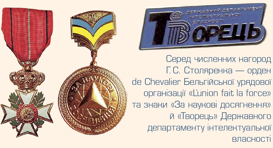 У 2008 р. професор Г. С. Столяренко удостоєний ордена de Chevalier (№ 2324) Бельгійської урядової організації «L’union fait la force».