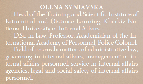 Олена Юхимівна Синявська у професійній діяльності вдало поєднала педагогічну майстерність, наукову діяльність та службу в органах внутрішніх справ.