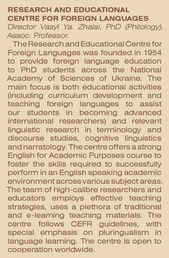 Центр наукових досліджень та викладання іноземних мов уже багато десятків років допомагає молодим науковцям системи Національної академії наук України досконало опанувати іноземні мови задля їхньої успішної професійної діяльності у сфері науки й освіти. Незважаючи на свій поважний вік, він не зупиняється на досягнутому та йде в ногу із викликами сьогодення, відкриваючи собі шлях перспектив як для освітньо-наукової, так і науково-дослідної діяльності. Його плідна навчальна й дослідницька робота високо оцінена як в Україні, так і за її межами й продовжує робити вагомий внесок у майбутнє вітчизняної науки. Величезний безперервний період існування цього закладу доводить, що мова — надважлива й актуальна в будь-який час професійна навичка, за допомогою якої можна досягнути взаєморозуміння з собою й світом. Цю ідею яскраво підкреслюють слова Сократа, що вже стали слоганом Центру наукових досліджень та викладання іноземних мов НАН України — «Заговори, щоб я тебе побачив».