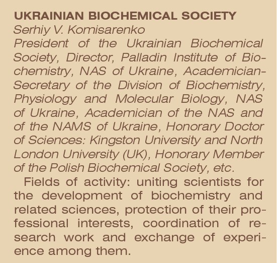 За вагомий внесок у розвиток біохімічної науки в Україні та підготовку наукових кадрів почесними членами Українського біохімічного товариства в різний час було обрано 40 видатних вітчизняних і закордонних науковців. На думку академіка НАН України С. В. Комісаренка, біохімія не знає меж у світі. Успішне виконання міжнародного проєкту «Геном людини», поява сучасних методів, які дають змогу у найкоротші строки визначати структуру нуклеїнових кислот та протеїнів, з’ясовувати механізми, які регулюють проліферацію, диференціацію та смерть клітин, — усе це тільки початок на шляху до програмованого винайдення ліків та генної терапії, до керування життєдіяльністю клітин та створення генетично модифікованих організмів. Від «геномікс» до «протеомікс» — цей девіз стосовно вивчення функціонально важливих протеїнів в організмі стає актуальним не тільки для вчених розвинених країн, а й для вітчизняних біохіміків.