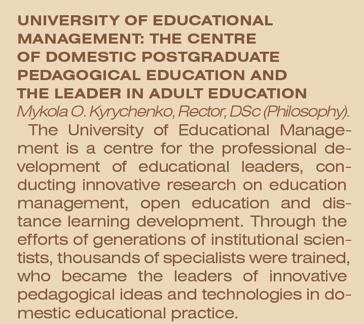 Один з найстаріших державних закладів післядипломної освіти в Україні Університет менеджменту освіти (УМО) — єдиний заклад вищої освіти в системі НАПН України. Наукова діяльність університету ґрунтується на засадах ідей андрагогіки, акмеології, педагогічної інноватики й спрямовується на реалізацію державної політики у сфері післядипломної педагогічної освіти, забезпечення безперервного професійного розвитку фахівців освітньої галузі, підвищення їхнього професіоналізму і конкурентоспроможності на ринку освітніх послуг, а також формування їхньої готовності до впровадження в освітню практику концепції «Нова українська школа».