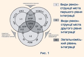 Комплексна реконструкція міста виступає засобом його адаптації в процесі існування (зміни параметрів матеріально-речової інфраструктури й функціональних характеристик його складових, удосконалення просторової організації) задля задоволення дедалі вищих вимог міського населення до умов життя. Реконструктивна діяльність у місті реалізується на трьох рівнях інтеграції. Перший рівень реконструктивних заходів має конкретну об’єктну спрямованість на рівні матеріально-речових структур міста і його функціональних складових та охоплює такі види реконструкції (див. рис. 1):