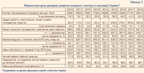 Прискорення розвитку науково-технічного прогресу в агропродовольчій сфері відбувається в процесі впровадження новітніх технологічних схем виробництва агропродовольчої продукції (енерго-, ресурсоощадних), використання високопродуктивних сортів і гібридів сільськогосподарських культур, внесення в ґрунт нетрадиційних видів органічних добрив, впровадження ефективних систем зрошення сільськогосподарських культур та ін. Загалом результативність розвитку аграрної науки та інноваційної діяльності підтверджується стабільними позитивними зрушеннями мікроекономічного (на прикладі зміни урожайності культур) характеру і макроструктурними змінами у динаміці ефективності агрогосподарювання (табл. 3), що відповідно впливає на економічне зростання держави загалом.