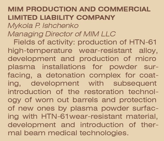Аналізуючи напрацювання фірми «МІМ» у галузі виробництва спеціальних сплавів і нанесення покриттів, М. П. Іщенко й науковці Центрального науково-дослідного інституту озброєння та військової техніки Збройних сил України опублікували статтю в Науково-технічному журналі «Озброєння та військова техніка» «Технологія відновлення стволів танкових та артилерійських гармат» (2017), у якій запропонували технологію відновлення зношених та захист нових стволів шляхом плазмового порошкового наплавлення з обраним зносостійким матеріалом ХТН-61, що покращить тактико-технічні характеристики гладкоствольних гармат і підвищить ресурс їхніх стволів.